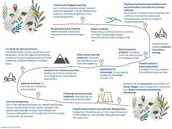 Im Rahmen von „The Art of Teaching“ entstand ganz im Sinne des diesjährigen Mottos der Innovativen Lehre „Teaching and Learning outside the Classroom“, eine Landkarte, die bedeutsame Wege und „Landmarks“ der sieben prämierten Lehrdesigns zeigt.