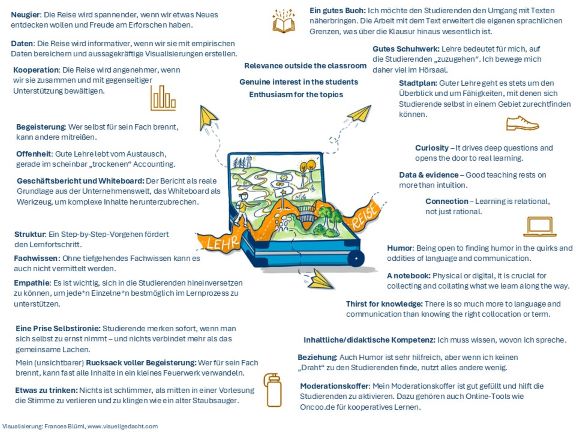 Doch jede Reise zu neuen didaktischen Landschaften beginnt mit einem gut gepackten Koffer. Die Preisträger*innen der Exzellenten Lehre haben uns verraten, was im Koffer ihrer persönlichen Lehrreise immer mit dabei ist. Was Sie darin finden? Unter anderem Eigenschaften wie Begeisterung, Neugier und Mut zum Ausprobieren, aber auch ganz konkrete Begleiter wie Strafrecht-Kodex, Geschäftsbericht, empirische Daten, online Tools und - nicht zu unterschätzen – gutes Schuhwerk und genug zu trinken.