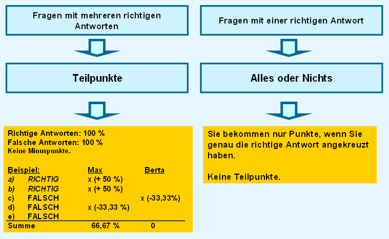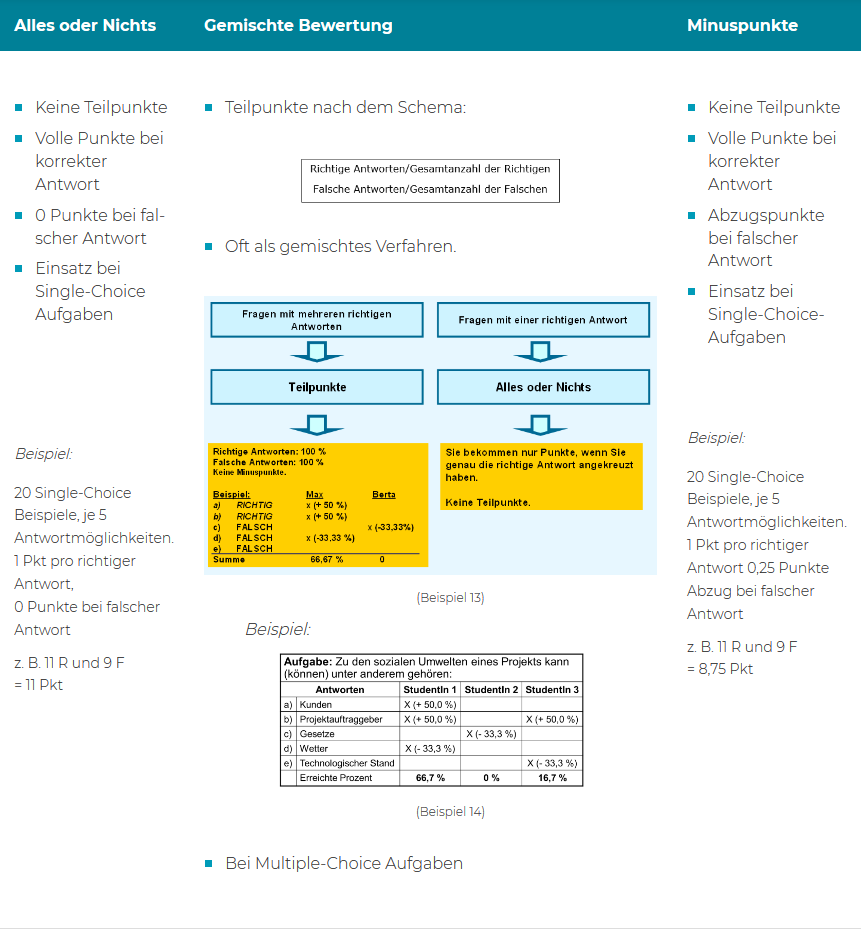 Bei der Beurteilung von Multiple-Choice-Aufgaben gibt es verschiedene Auswertungsschemata, die angewandt werden können. Um zu einer Leistungsbeurteilung zu kommen, ist die Auswahl eines entsprechenden Schemas notwendig, das sowohl dem Fragetyp, als auch der Prüfungssituation (z. B. Zeitdruck) entspricht. Dies ist vorzugsweise bereits vor Erstellung der Prüfungsfragen zu bedenken. Unterhalb finden Sie eine kurze Beschreibung der wichtigsten drei Bewertungs-Schemata, sowie eine grafische Übersicht: