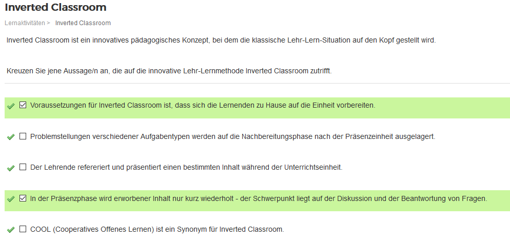 Bei diesem Frageformat wird nach der falschen Antwort gefragt. Aufgaben mit mehreren richtigen Antworten können auf diese Weise sehr einfach abgeprüft werden. Der Vorteil liegt darin, dass bei der Erstellung nur eine nicht richtige Antwort formuliert werden muss.