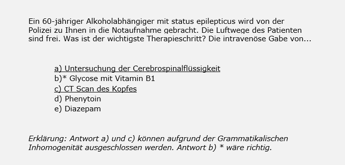 • Grammatikalische Inhomogenität: Die falschen Antworten können ohne Fachwissen ausgeschlossen werden, da der Satz grammatikalisch nicht korrekt abgeschlossen wird.
