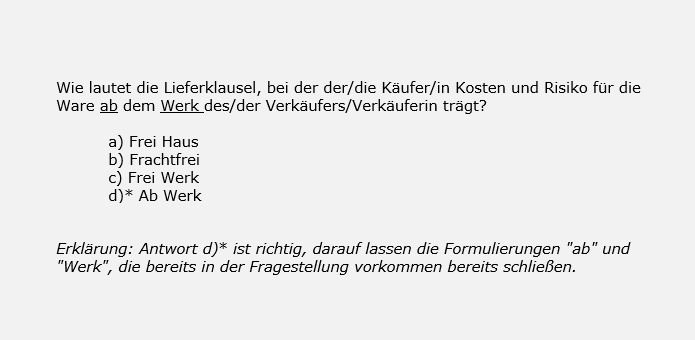 • Wortwiederholung aus dem Stamm: Worte oder Formulierungen aus dem Stamm oder der Frage deuten auf korrekte Lösungsalternativen hin.